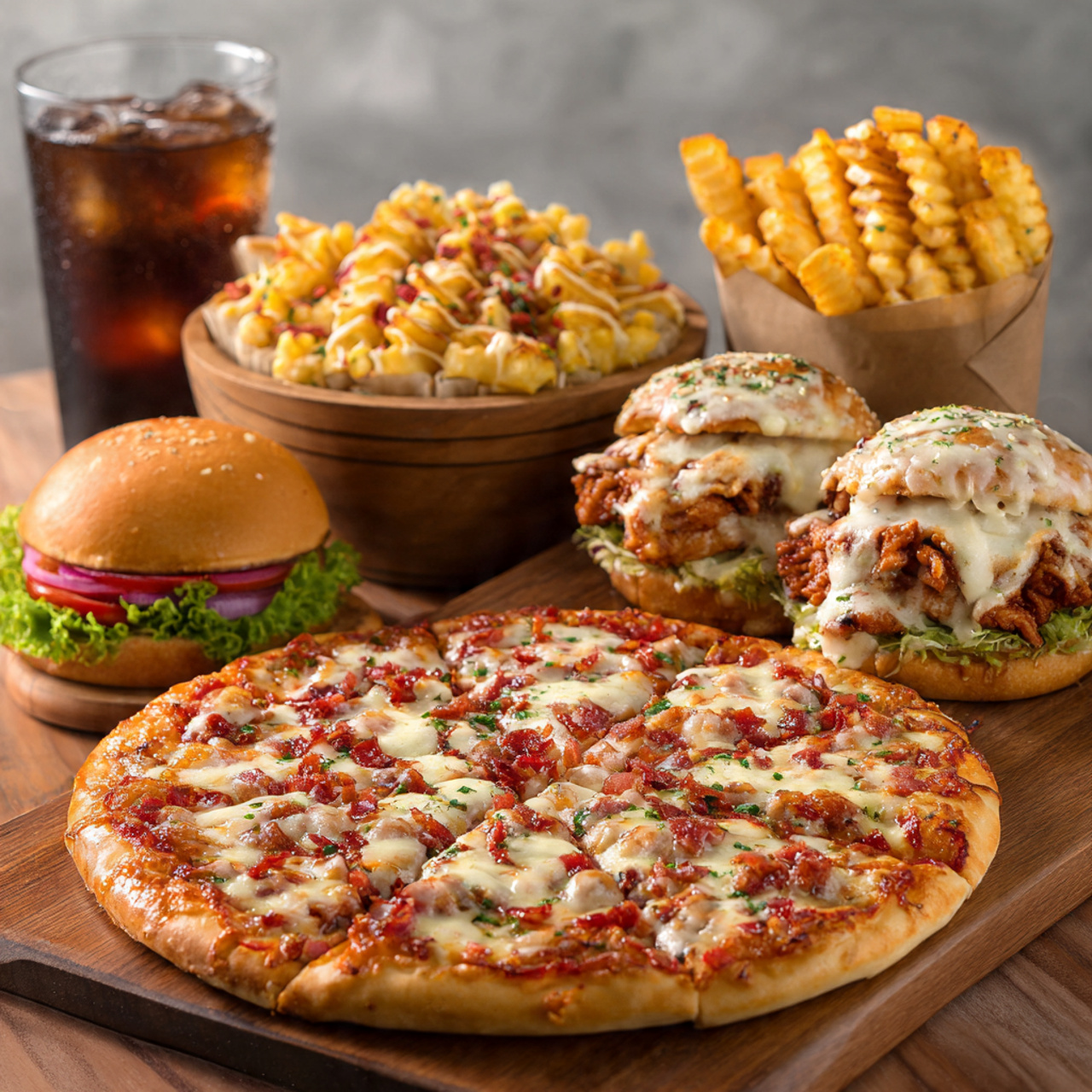 Includes 1 Large Pizza, 3 Zinger Burgers, 1 Loaded Fries, and 1.5 Liter Drink for a full, indulgent meal.