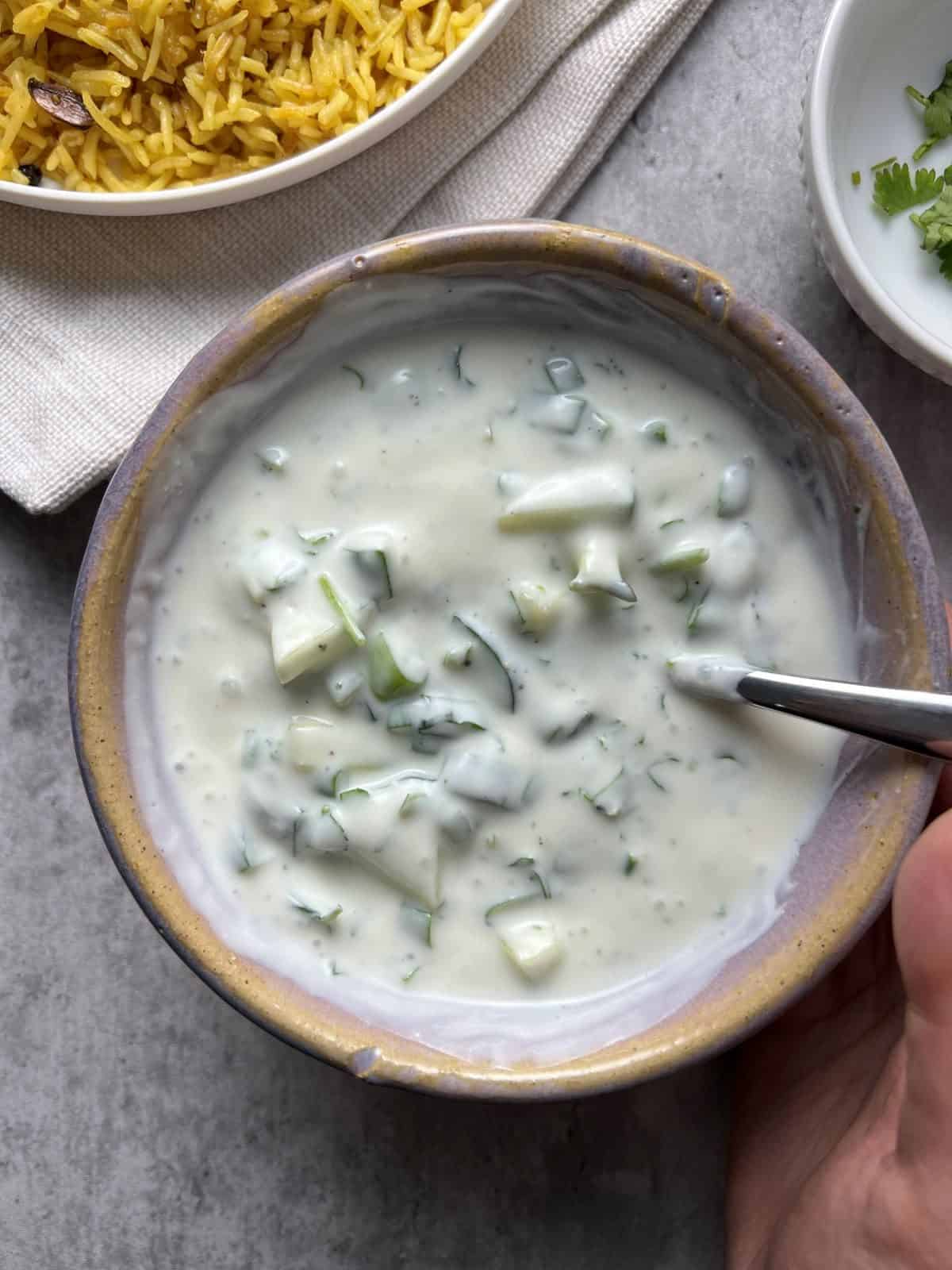 A cooling yogurt-based side made with fresh yogurt, herbs, and spices. Smooth, refreshing, and mildly tangy, it perfectly complements spicy dishes and adds a soothing touch to any meal. 🥄🥛🌿